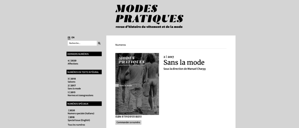 Le numéro 2 de Modes pratiques est en préparation pour une publication prévue en décembre.Il aura pour thématique Sans la mode et comptera une trentaine de contributions.